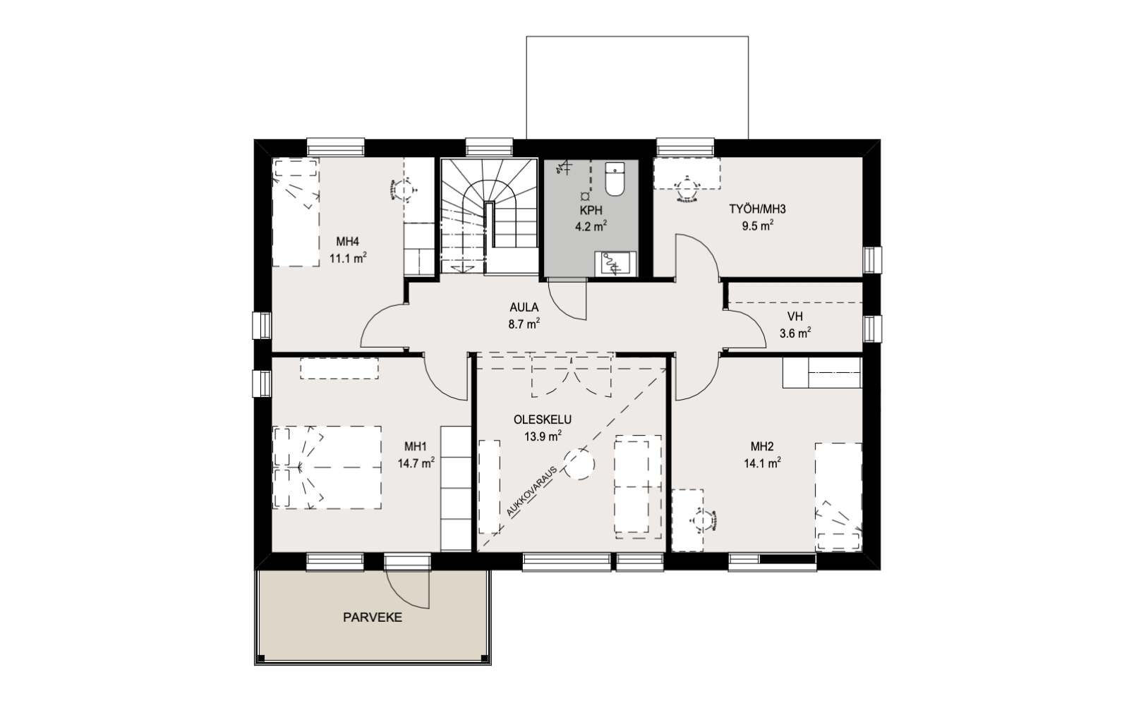 Deko 199 on myös Dekotalon 2-kerrostalomalliston ikisuosikki. Tämä talomalli taipuu moneen ja siinä on tilaa suurellekin perheelle! Vakiomallissa on jo viisi makuuhuonetta, mutta yläkerran oleskelutila on helposti muunnettavissa tilavaksi lisämakuuhuoneeksi. Vai haluatko kenties olohuoneeseen avaruutta korkealla avoimella tilalla? Eteisen ja teknisen tilan yhdistelmään voit lisätä vaikkapa kätevän kurahuoltopisteen. Tässä suosikissa vaihtoehtoja todellakin riittää!