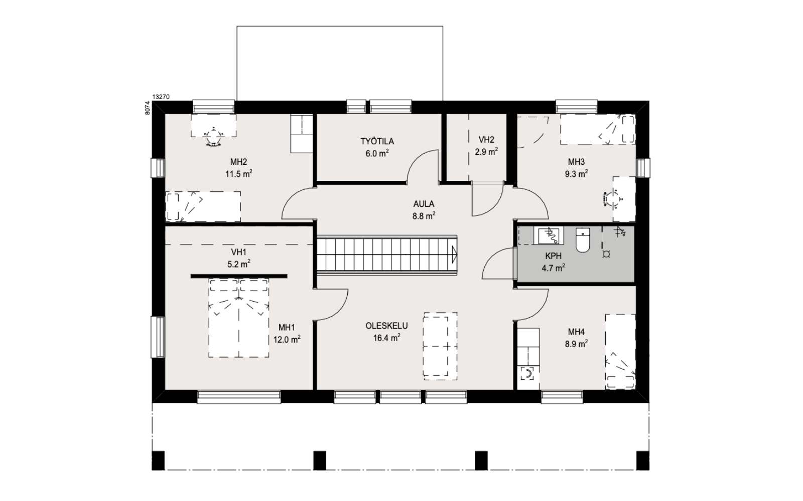 Tästä talomallista ei puutu mitään! Koko talon läpi avautuva erittäin tilava olokeittiö on kiistatta tämän kodin sydän. Näyttävä koko talon levyinen terassi suorastaan kutsuu viettämään aikaa koko perheen ja ystävien kesken. Yläkerran pohjaratkaisussa on mietitty arjen toimivuutta yläkerran erillisen kylpyhuoneen, kahden vaatehuoneen ja kompaktin työtilan muodossa.